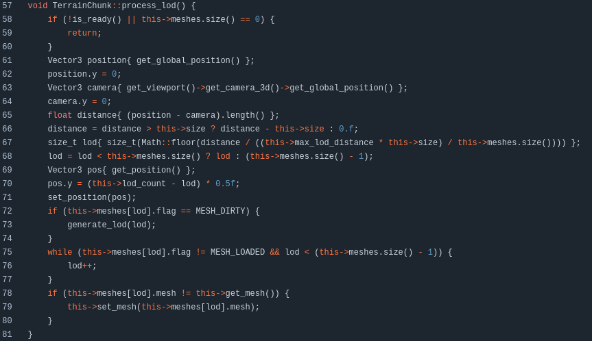 The actual representation of the terrain is the aforementioned terrain chunks. These inherit Godot's MeshInstance3D. Which means they have a mesh. On top of the base class' data, they keep a separate list of LOD meshes.