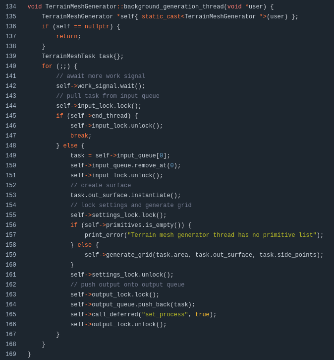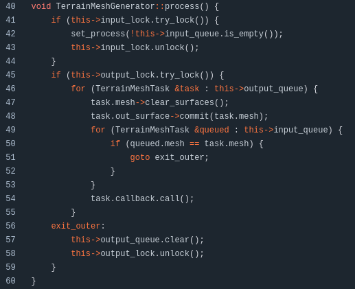 On the main thread, the output queue of surface descriptions is processed into usable meshes, which are then committed to their respective MeshChunks. Here the queue also checks if the mesh has been re-queued, in which case the output queue is invalidated to avoid doing double work.