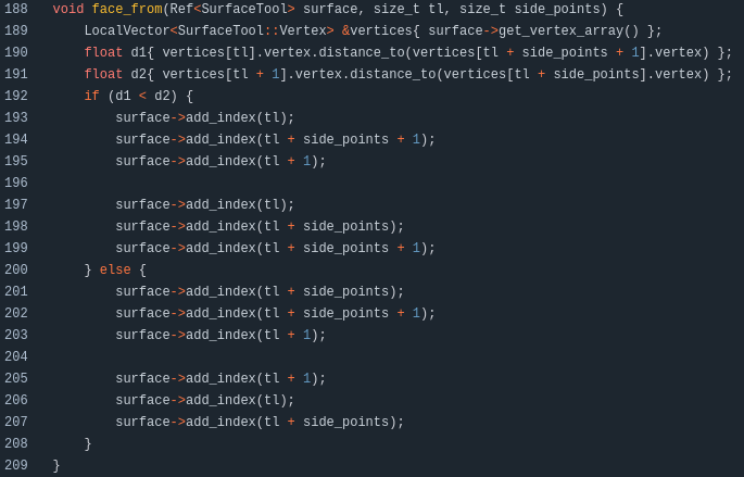 The second is connecting the created points along the shortest edge. Which ensures smooth-looking edges and cliffs. As well as avoiding the jarring jagged edges that are created when generating with a fixed edge direction.
