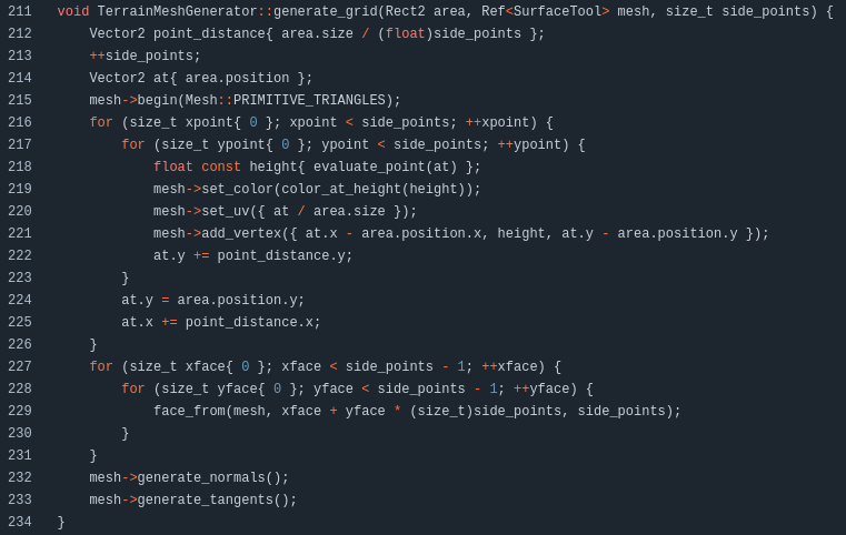 The mesh generation procedure runs in two phases. The first is constructing a grid of points, each at a height evaluated from the primitive list.